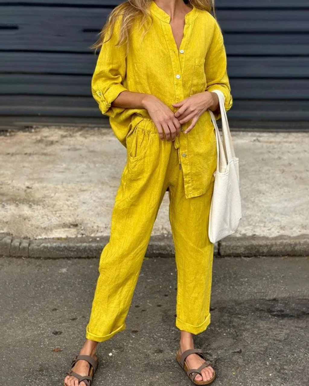 Sinta-se elegante e confortável com o Conjunto Feminino de Linho e Algodão, projetado para os dias frescos da primavera e outono.