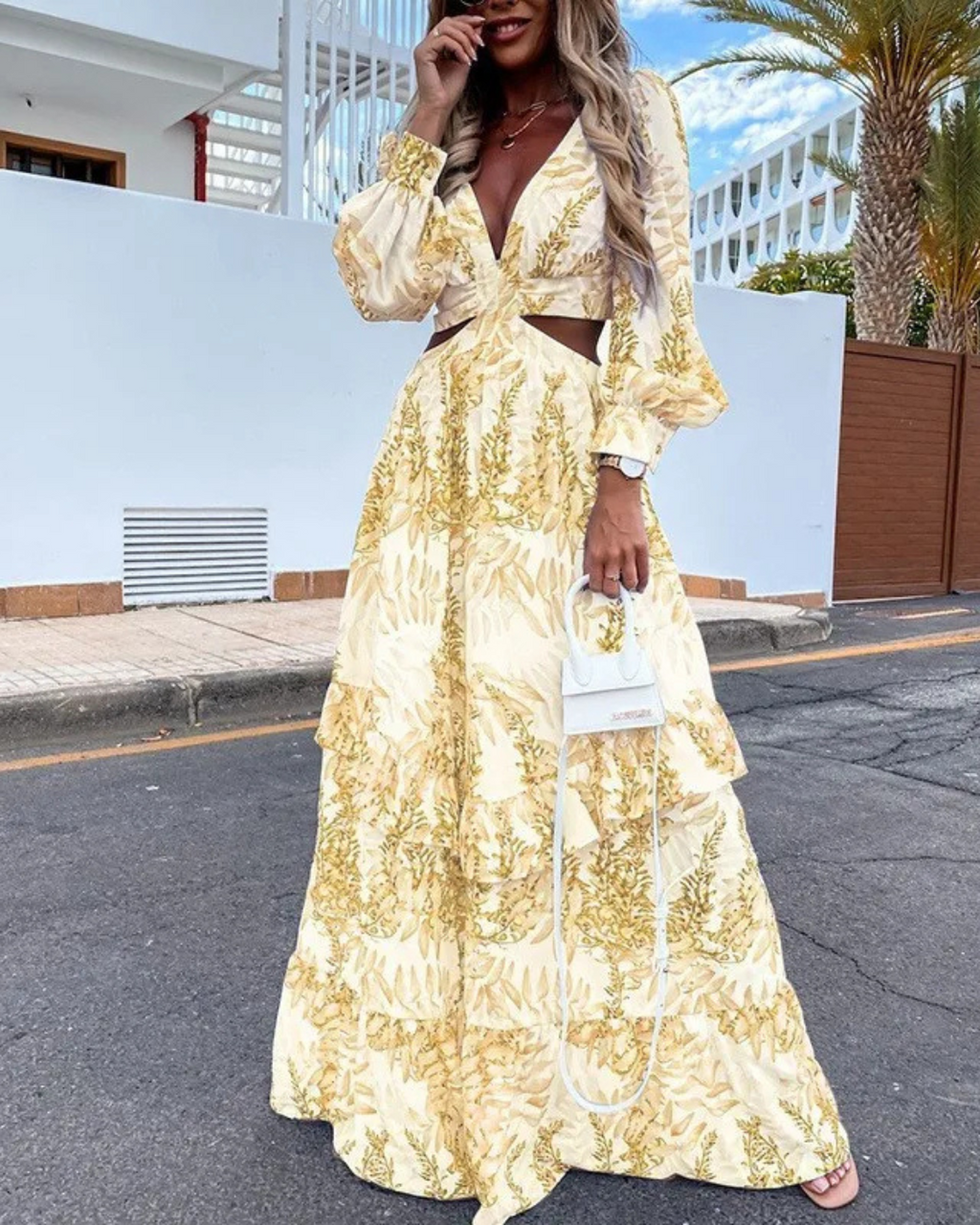 Estilo: Decote V, mangas longas, detalhes hollow out, babado na saia, modelagem maxi, recortes elegantes.